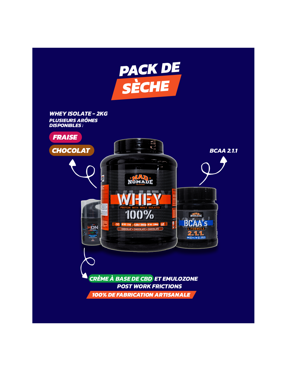 Pack de Sèche – Whey Isolate Chocolat ou Fraise 2kg + BCAA 500g + Crème à base de CBD et Emulozone Bien-être Pré/Post Work