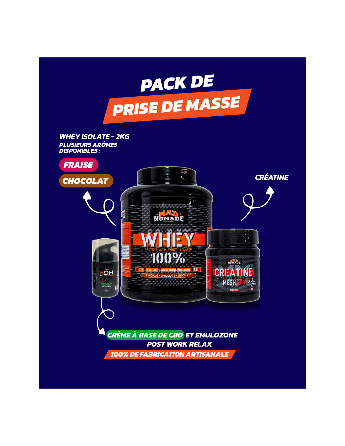 Pack de Prise de Masse – Whey Isolate Chocolat ou Fraise 2kg + Créatine 300g + Crème à base de CBD Bien-être Post Work Relax